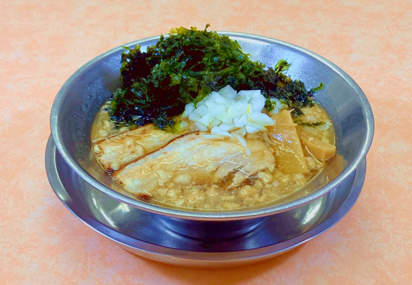 新潟5大ラーメンの一角で人気の背脂ラーメン。中太の麺と豊富な背脂が特徴。地場産のメタル丼で提供しています。