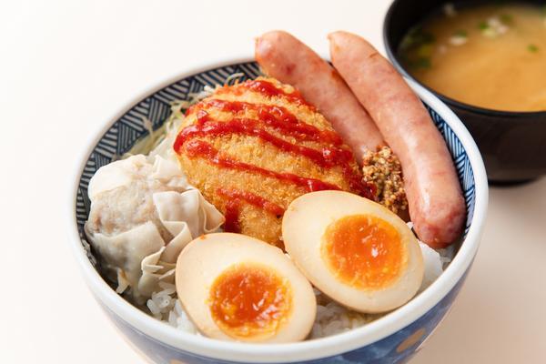 新潟名物タレカツ丼を更にボリュームアップしました。温泉たまごでまろやかにしつつ、少し辛みのきいたガーリックオイルでパンチをきかせたメニューです。