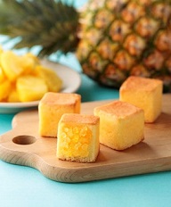 パイナップル果肉がたっぷりの新感覚スイーツ。しっとり豊かな甘みが広がるかわいらしいキューブ型の焼き菓子です。