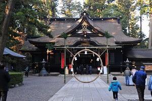 玉砂利の音が心地いい参道を上っていくと、朱色の荘厳な門、その奥に黒漆の美しい本殿があります。