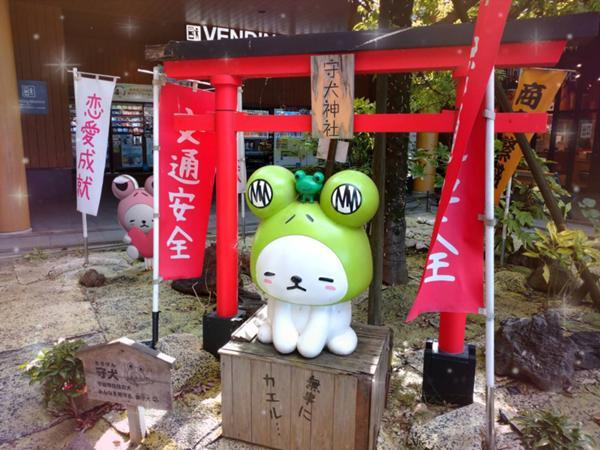 ご存じの方も多いと思いますが、守犬は、カエルの被り物をした犬です。
