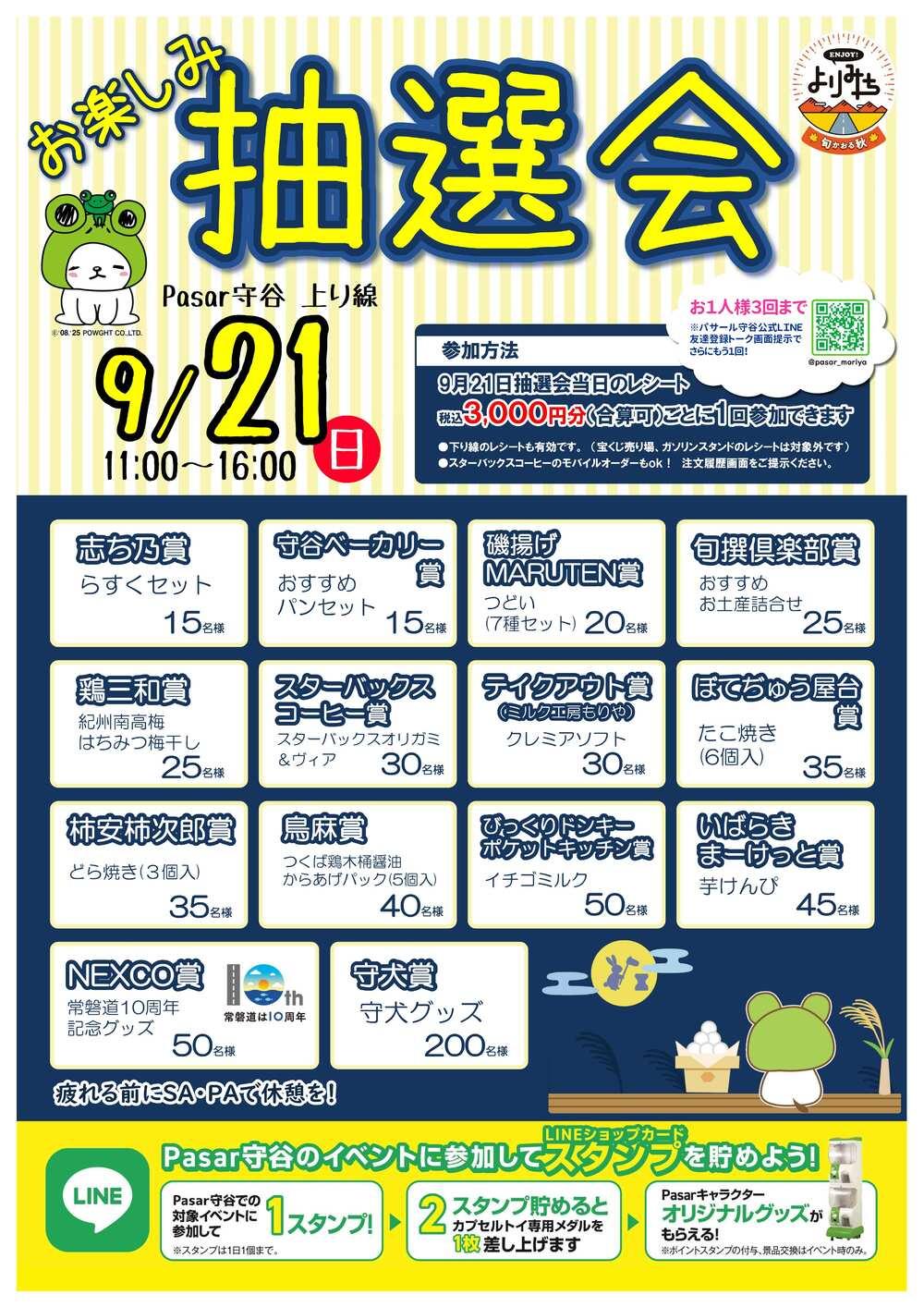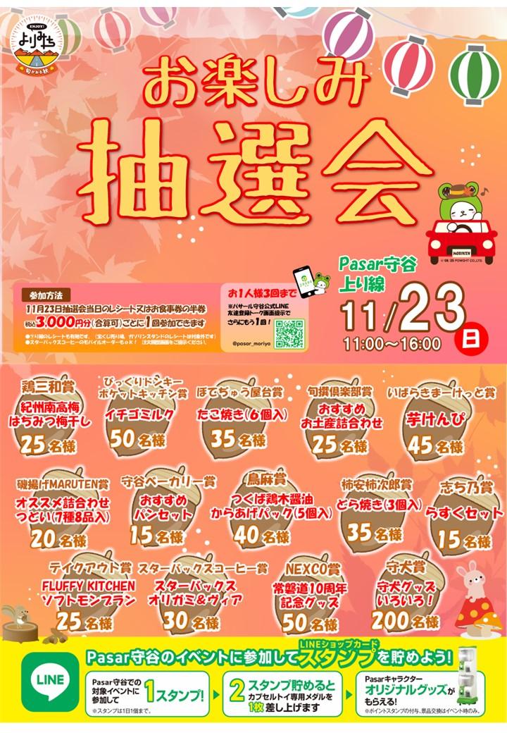 【お知らせ】オリジナル「守犬栗風ぬいぐるみ」を手に入れよう♪ 2025.11.04 駄菓子まつり、開催中! 2025.11.03 茨城弁の魔法の言葉『いやどうも』 2025.11.01 揚げ物好きの皆さまにお知らせ(∩´∀`)∩ 2025.10.16 【アトリウム】ミレメーレのアップルパイが帰ってきました! 2025.10.01 非現実的な空間を味わいませんか? 2025.10.01 【お知らせ】お楽しみ抽選会について(10/19(日)) 2025.09.27 九州物産市、開催中です! 2025.09.18 守谷SA、秋の味覚 2025.09.16 【お知らせ】お楽しみ抽選会について(9/21(日)) 2025.09.10 北海道スイーツはいかがですか? 2025.09.05 ★★★予告★★★ 絶対おススメ!! 北海道スイーツフェア≪ロイヤルスイーツ≫が開催されます! 2025.09.01 ハマることまちがいなし!! 2025.09.01 アトリウム、待望の再開です!【京都・関西おみやげ市】 2025.08.21 みずみずしい梨はいかが? 2025.08.16 メロンソフトにメロメロ~♪ 2025.08.01 一年中お芋なんです... 2025.07.16 【お知らせ】Pasar守谷下り線開業10周年記念BIGガラポン大抽選会について(7/6(日)) 2025.07.03 北海道物産市、はじまりました! 2025.07.02 色鮮やかな層のお菓子 2025.07.01 おにぎり?おむすび?? 2025.06.16 いつもとひと味違う「旨いもの市」開催中! 2025.06.13 【お知らせ】お楽しみ抽選会について(6/22(日)) 2025.06.11 【お知らせ】オリジナル「守犬保冷バッグ」を手に入れよう♪ 6/8(日) 2025.06.04 雨の日だからこそ行きたい! 2025.06.01 「陶器市」オープンしました! 2025.05.28 6月はおトクにお買い物♪『ショッピングチケット』プレゼント! 2025.05.24 茨城県はメロン生産量№1 2025.05.16 【お知らせ】お楽しみ抽選会について(5/25(日)) 2025.05.14 北海道物産市、始まりました!! 2025.05.10 大人気商品に期間限定でいちご味が登場しました!!! 2025.05.01 いつもと違う景色です✧♡ฅʕ •ﻌ• ʔฅ♬*゚ 2025.04.17 ☆☆☆銘品降臨!☆☆☆ Pasar守谷(上り線アトリウム)は、ひと足早く満開の春です! 2025.04.01 がんばれ柏!応援しています 2025.03.26 【お知らせ】パサール守谷感謝祭の開催について(3/20((木・祝) 2025.03.14 【お知らせ】お楽しみ抽選会について(3/16(日)) 2025.03.12 いちごフェア開催中です! 2025.03.12 ★★★新潟の珍味を一堂に!★★★ 2025.03.07 【謹 告】 御 神 体 奉 遷 2025.02.28 こだわりの濃い黄味 2025.02.26 <Pasar守谷LINEお友だち必見追加情報!!>守犬のお誕生日は何をする? 2025.02.21 【お知らせ】お楽しみ抽選会について(3/2(日)) 2025.02.21 ☆☆☆北の国からやって来た、おいしいものたち☆☆☆ 2025.02.15 旬の味!イチゴのどら焼き 2025.02.12 【お知らせ】お楽しみ抽選会について(2/9(日)) 2025.02.04 謎解きイベント開催中! 2025.01.29 Pasar守谷で、ショッピングチケットをゲットしよう! 2025.01.28 旨いもの市、開催中です! 2025.01.22 1月26日(日)守谷SA上り線で待ってまーす!! 2025.01.20 初〇〇、何にしますか? 2025.01.15 ☆☆☆新潟のスイーツはいかがですか?☆☆☆ 2025.01.11 年初のアトリウム営業につきまして 2025.01.07 毎年【特集名】が楽しみなんです! 2025.01.03 あけましておめでとうございます 2025.01.01 謹賀新年 2025.01.01 今年もお世話になりました。 2024.12.31 2025年最初のノベルティプレゼントは。。。 2024.12.25 守犬神社リニューアルしました! 2024.12.20 心が癒される時間 2024.12.18 ☆☆☆諸国探訪市、開催中です!!☆☆☆ 2024.12.14 【告知】今年最後の抽選会(12月22日(日)) 2024.12.12 栗好きにはたまらない 2024.12.04 Pasar守谷オリジナル マフラータオルを手に入れよう! 2024.11.22 ☆彡「陶器市」、開催中です!☆彡 2024.11.22 願い事は... 2024.11.20 ★★告知!★★ 抽選会開催します! 2024.11.12 ☆☆☆新潟物産市、始まりました!☆☆☆ 2024.11.07 アジフライに、なにかける? 2024.11.07 ガッツリ食べても大丈夫!? 2024.11.06 ★★11月1日~★★ショッピングチケットが始まるよ! 2024.10.30 夜しか見られない表情です☆彡 2024.10.23 世界のキティは、やっぱりかわいかった。。。件 2024.10.20 涼しくなってきましたね。。。 2024.10.19 キティちゃんがあそびにくるよ!【10/20(日)上り線】 2024.10.17 駄菓子まつり、開催中です! 2024.10.17 ♪天体観測 ほうき星を探して~ 2024.10.09 【本日開催!】キャラクターキャラバン in 守谷【10月5日(土)】 2024.10.05 ★☆★ENJOY!よりみち 旨いもの市 開催中です!!★☆★ 2024.10.04 旬の野菜が主役のレストラン『さんち家』 2024.09.25 散策していたら見つけました! 2024.09.11 満足度NO.1の焼肉屋 2024.08.28 カリもちベーグル 2024.08.14 冷たいどら焼きはいかがですか? 2024.07.31 肉がバンズ? 2024.07.17 今が旬の夏野菜 2024.07.03 東京で魔法のような体験ができる 2024.06.19 世界のドーナツが大集合♪ 2024.06.05 都会のオアシス!小岩菖蒲園 2024.05.22 じゃじゃん♪問題です! 2024.05.08 takeoutしてお出かけしましょう! 2024.04.24 グルメな休日 2024.04.10 四季折々の風情 2024.03.27 良い匂いに誘われて 2024.03.13 お待たせしました! 2024.02.28 富士山、2分で登頂! 2024.02.14 がんばれ、石川県!がんばれ、北陸! 2024.01.31 外はサクッと!中はジュワッと! 2024.01.17 初詣はここで決まり! 2024.01.03 謹賀新年 2024.01.01 守犬グルメ♪ 2023.12.20