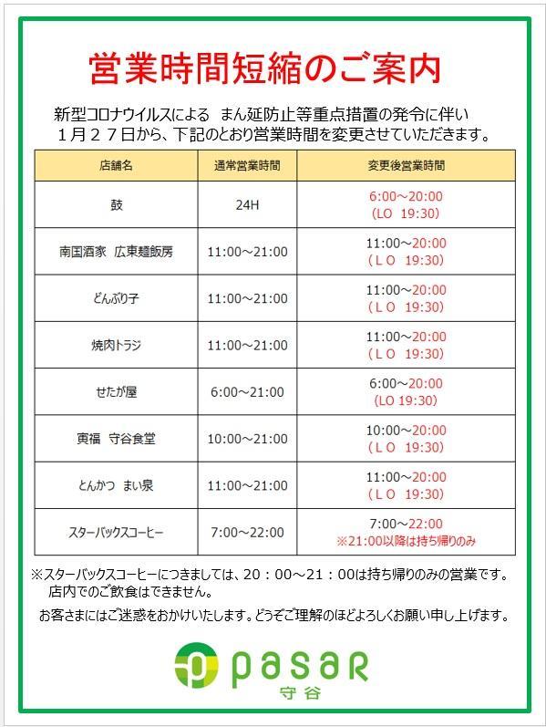 営業時間の変更のお知らせ(1/27~) いつもPasar守谷をご利用いただきまして、誠にありがとうございます。 下記のとおり、一部店舗にて営業時間を変更いたしますので、お知らせいたします。 お客さまにはご不便をおかけいたしますが、ご理解・ご協力のほどお願い申し上げます。