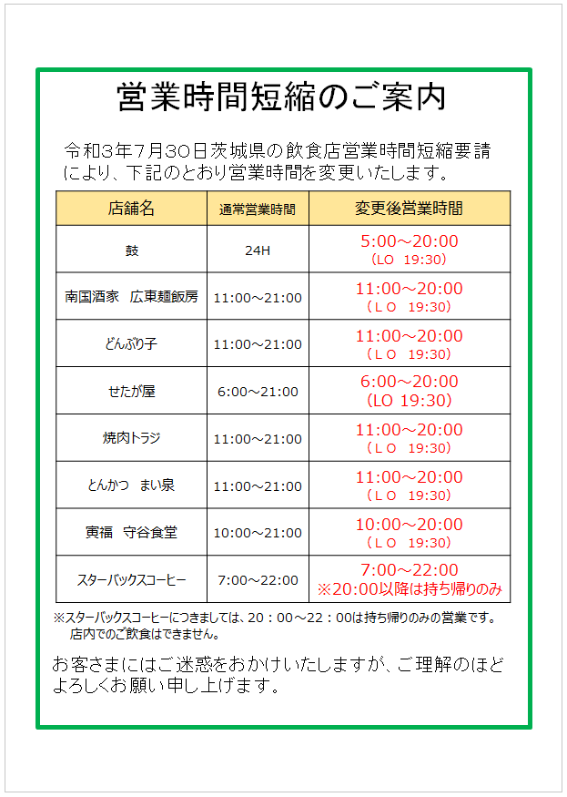 【7月30日~】一部店舗の営業時間短縮のお知らせ いつもPasar守谷(下り線)をご利用いただき誠にありがとうございます。 茨城県による飲食店の営業時間短縮要請に基づき、Pasar守谷(下り線)では一部店舗の営業時間の短縮を実施いたします。 お客さまにはご不便をおかけいたしますが、ご理解賜りますようお願い申し上げます。