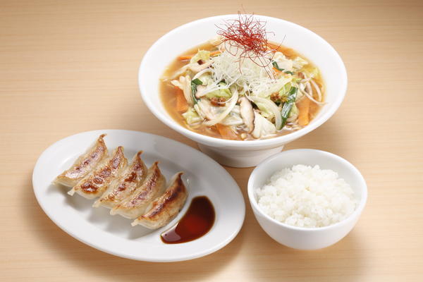 キャベツ、タマネギ、人参などの野菜をフライパンで炒めたオリジナル味噌らーめん+ローズポークを使用した焼きたてでジューシーなオリジナル餃子5個+ライスと友部のオリジナルがぎっしり詰まったお得セット。トラッカーに大好評『いいね』続出の人気メニューです。
