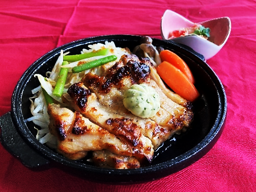 柔らか網焼きチキンを熱い鉄板にのせ!