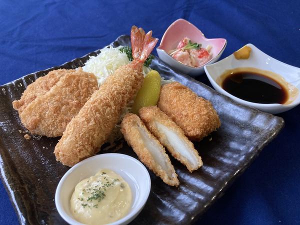 プリプリ大海老フライ、柔らかヒレカツ、とろ~りクリームコロッケ、サクッとイカフライの4種盛り。秘伝のソースとタルタルソースで美味しさ倍増!!