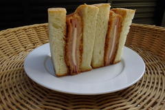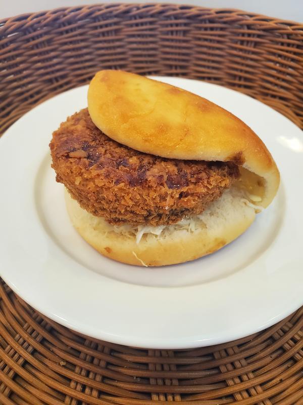 半円型の耳まで柔らかい食パンにカマンベールチーズ入りポークハムカツと秘伝のソースを合わせました。
