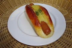 オニオン入りの生地に粗びきポークフランクと冷めてものびるチーズを乗せて焼き上げました。