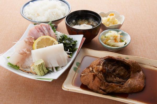 刺身と煮魚が付いたお得な定食です。ご飯お替り大盛り自由です。港の水揚げにより刺身・煮魚の種類が日々変わります。なお、魚の水揚げ状況(港の悪天候等)により販売不可の場合もありますのでご了承下さい。