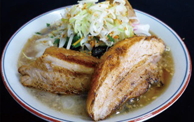 自家製の炙りチャーシューと盛り沢山の野菜が食べごたえ抜群。
