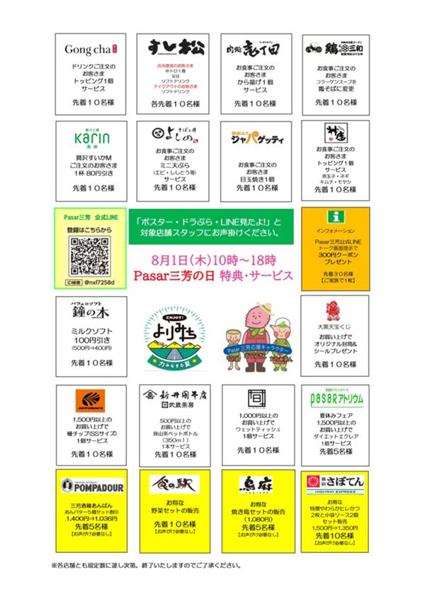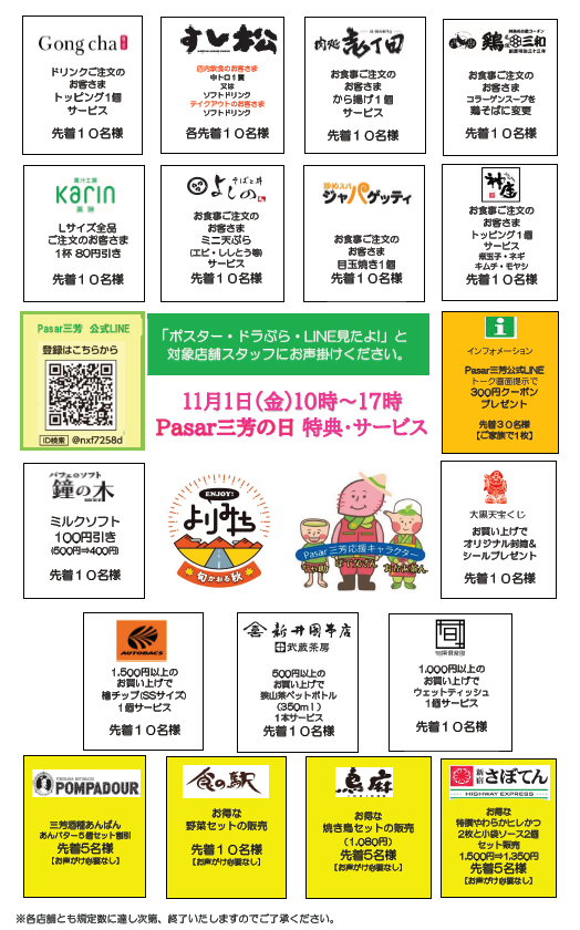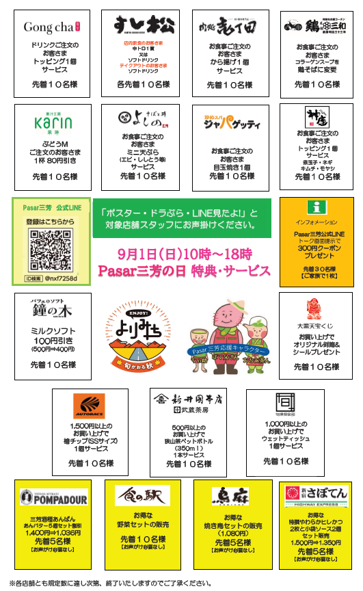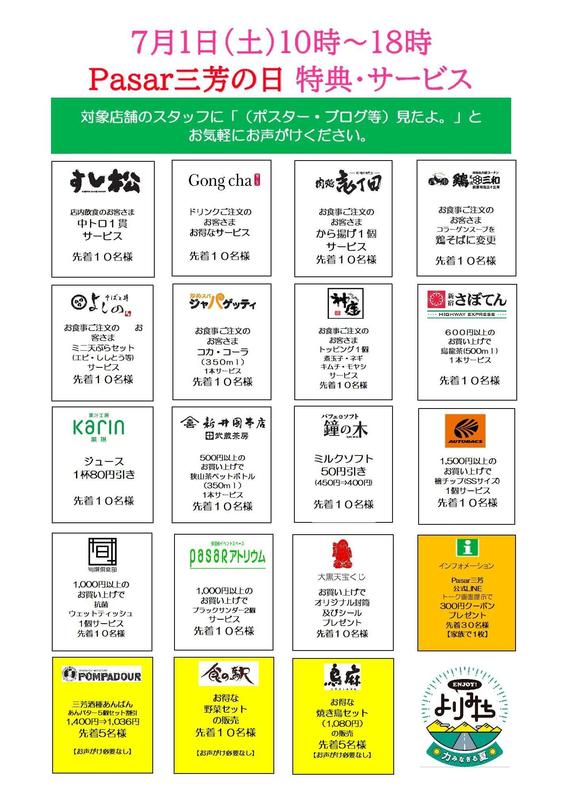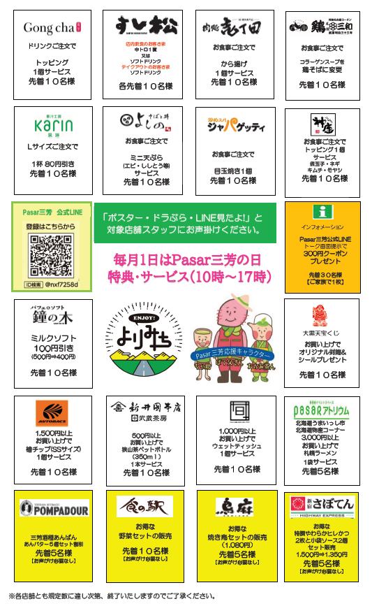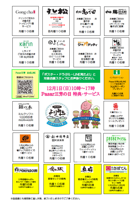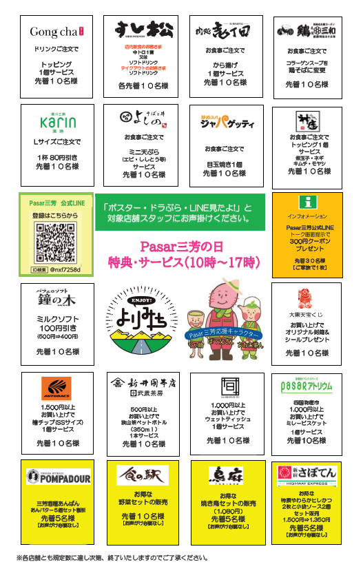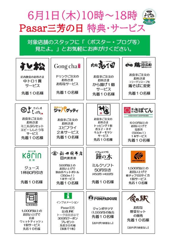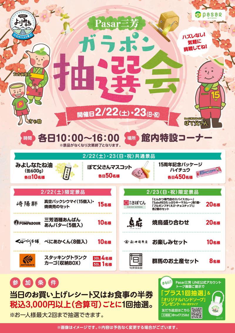視界良好 2025.12.14 冬備えのオススメ第二弾! 2025.12.13 おすすめソフト(*゚▽゚*)♪ 2025.12.08 ENJOY! よりみち クリスマスフェア 開催中 2025.12.06 簡単・お手軽♪撥水スプレー! 2025.12.01 体感型デジタルアート劇場 浮世絵RE:BORN 2025.12.01 ご当地銘菓・銘品フェア(*'▽'*) 2025.11.30 11/22(土)・23(日)限定!税込2,200円以上お買い上げで「肉じゃが」をプレゼント! 2025.11.22 【11/23(日)、24(月)開催】富の川越いもプレゼント! 2025.11.18 冬備えのオススメ! 2025.11.15 鉄道博物館 2025.11.15 ご当地銘菓・銘品フェアが始まりました!! 2025.11.08 本日最終日です!! 2025.11.06 Pasar三芳店限定大特価! 2025.11.04 秋の味覚 2025.11.01 季節限定の芋なっとうが入荷しました♪ 2025.10.29 関越道開通40周年記念フェアオススメ商品(*^_^*) 2025.10.24 【10/26(日)開催!】関越道全線開通40周年記念抽選会のお知らせ 2025.10.20 関越道開通40周年記念フェア開催中です✨ 2025.10.15 関越道開通40周年記念フェア 2025.10.15 雨を弾いてよく見える♪ 2025.10.14 【10/11〜13限定】1,500円以上でウーロン茶プレゼント&海苔重フェア開催!! 2025.10.11 第2回ハイウェイめし甲子園が始まりました!! 2025.10.06 さぼてん海苔重フェア!! 2025.10.05 秋のスィーツ、おススメは和パフェ☆彡 2025.10.04 秋の七味祭開催中✨ 2025.10.01 オススメ防災セット! 2025.10.01 【9/27・28限定】秋のキャンペーン♪2,200円以上でスパイスカレープレゼント! 2025.09.26 【9/20(土)・21(日)開催】お菓子すくいどり!! 2025.09.16 おすすめ商品のご紹介(*^^*) 2025.09.15 今年も開催します! 2025.09.15 敬老の日のプレゼントにもオススメ! 2025.09.14 9/13〜15かつモンのプチえびがもらえるキャンペーン開催♪大粒カキフライ登場! 2025.09.13 楽々充電ホルダー! 2025.09.01 智光山 こども動物公園 2025.09.01 ENJOY!よりみち 秋のおすすめメニュー 2025.09.01 お気に入りの色と香りで車内空間を彩る 2025.08.22 8/16・17限定!2,200円以上でキーマカレープレゼント! 2025.08.16 水遊び! 2025.08.15 よくある困った時に便利なお掃除アイテム☆ 2025.08.12 武蔵野うどん 2025.08.01 【三芳店限定】8月だけの特別メニュー登場!! 2025.07.31 【7/27(日)】まめっち&めめっちが遊びにくる! 2025.07.25 【7/19・20・21限定】1,500円以上でプチチョコチッププレゼント!! 2025.07.18 折りたたみ傘型サンシェード♪ 2025.07.17 天然炭酸水 2025.07.15 【7月20日(日)・21日(月・祝)開催!】キャンバストートプレゼント! 2025.07.15 夏休みにオススメ商品のご案内★ 2025.07.05 【7/5・6限定】1,500円以上で烏龍茶♪5のつく日・夏限定メニューも! 2025.07.04 どれも美味しい! 2025.07.03 【6/23〜29限定】ミニかつサンド3個セットでウーロン茶プレゼント♪ 2025.06.23 【6月20日(金)開催!】野菜詰め放題プレゼント 2025.06.17 りっくんランド 2025.06.14 6/14・6/15キャンペーンのお知らせ‼︎ 2025.06.13 5のつく日は引き続きお得!&アジフライ販売スタートのお知らせ! 2025.06.05 関西 中部フェア 2025.06.01 ENJOY!よりみち 夏のおすすめメニュー 2025.06.01 5/24・5/25キャンペーンのお知らせ‼︎ 2025.05.24 工場直売所 【菓楽】 2025.05.15 さぼてんの5のつく日限定キャンペーン‼︎ 2025.05.14 ENJOY! よりみち 駄菓子まつり 2025.05.13 さぼてんの母の日キャンペーン‼︎ 2025.05.09 今年も戻ってきてくれました☆彡 2025.05.02 さぼてんのゴールデンウィークキャンペーン‼︎ 2025.05.01 【ぽて父さんも参加します】5月10日(土) 三芳町子どもフェスティバル 2025.04.30 お出かけ日和* 2025.04.14 ENJOY! よりみち 東日本旨いもの市開催中です 2025.04.01 2025.04.01 寝ぼけ堂 直売所 2025.03.20 ENJOY!よりみち「GRAND MENU」(看板商品) 2025.03.17 ぽて父さんがやってきた! 2025.03.17 ENJOY!よりみち 春のおすすめメニュー 2025.03.17 ホッと一息♪ 2025.03.10 ワクワクするメニューがいっぱいの「さぼキッズ」メニューのご紹介♪ 2025.03.02 都内を散策... 2025.03.01 3月1日(土)はPasar三芳の日! 2025.02.27 トミカ新商品入荷のお知らせ♪ 2025.02.21 古き良きたてもの 2025.02.20 【告知】2月22日(土)、23日(日・祝) ガラポン抽選会開催! 2025.02.14 最近のおすすめ 2025.02.11 ENJOY! よりみち 金物陶器市開催中! 2025.02.07 AQ.商品ランキング♪ 2025.02.07 遅い初詣 2025.02.01 お店で手巻き!ごちかつ恵方巻き! 2025.01.30 2月1日(土) Pasar三芳の日 !(^^)! 2025.01.30 新商品のご案内★ 2025.01.24 いちご狩り・・・ 2025.01.20 ENJOY! よりみち 北海道うまいっしょ市やってますよ 2025.01.16 2025.01.10 冬のおすすめ商品のご案内★ 2025.01.10 さぼてん自慢の福袋が今年も登場!! 2025.01.05 新年おめでとうございます 2025.01.02 ENJOY! よりみち 年末年始旨いもの市開催中 2024.12.27 【1月2日、3日】新年 獅子舞いイベント開催 2024.12.26 元日もPasar三芳の日! 2024.12.25 *クリスマスプレゼントに~* 2024.12.20 狭山茶ソフト 2024.12.20 ぽて父さんのお茶ペン!! 2024.12.17 【告知】12月22日(日) クリスマス大抽選会開催! 2024.12.11 ☆★☆イルミネーション★☆★② 2024.12.10