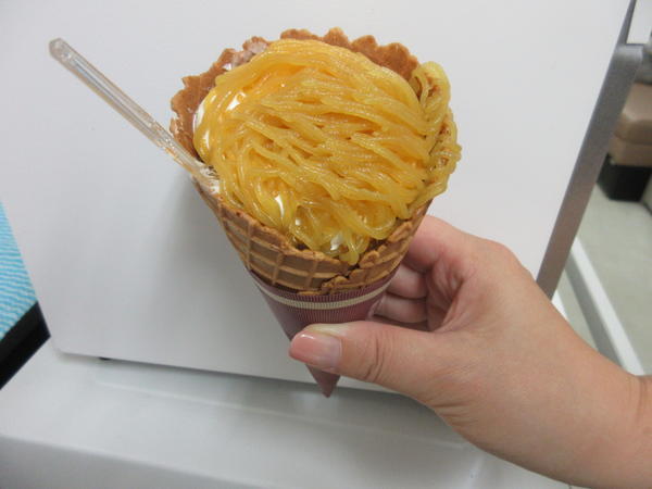 下は北海道ソフトクリーム、上には芋のペーストを絞っています。