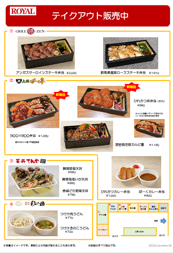 お食事は、赤城ポークを使用したとんかつや水沢うどんをお召し上がりいただけるレストラン「黄金色の豚」をはじめ、フードコート内には溶岩焼きの豚肉をのせた丼が味わえる「上州ぽ~く亭」、埼玉県産地粉のうどんが楽しめる「饂飩 蕎麦 彩の国」などの5店舗が並びます。