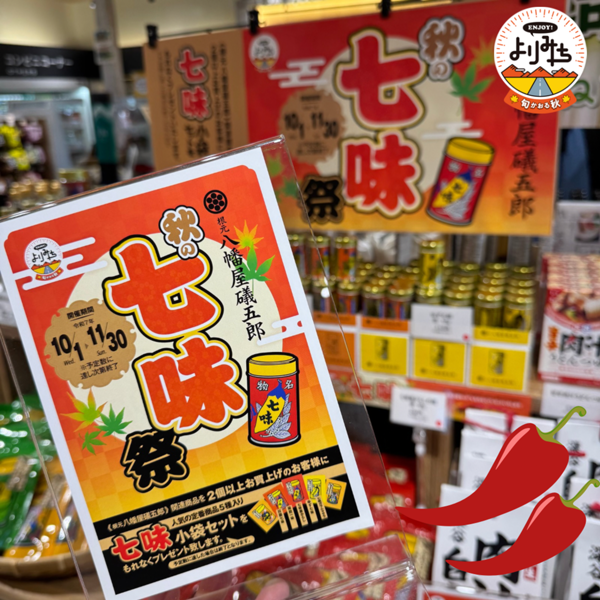 ショッピングコーナーで販売している八幡屋礒五郎関連商品を2個以上お買い上げのお客さまに、もれなく「七味小袋セット(人気の定番5種入り)」をプレゼントします!