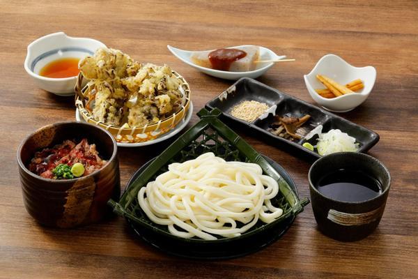 日本三大うどんの「水沢うどん」、地元吉岡町産「百日舞茸の天ぷら」、群馬県産「こんにゃく」。上州名物を是非ご賞味ください。