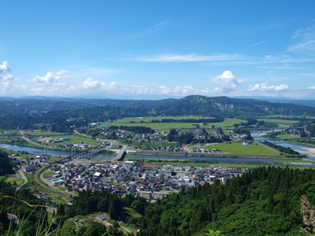眼下には川口地域の街並みと、「信濃川」「魚野川」の合流地点が見える