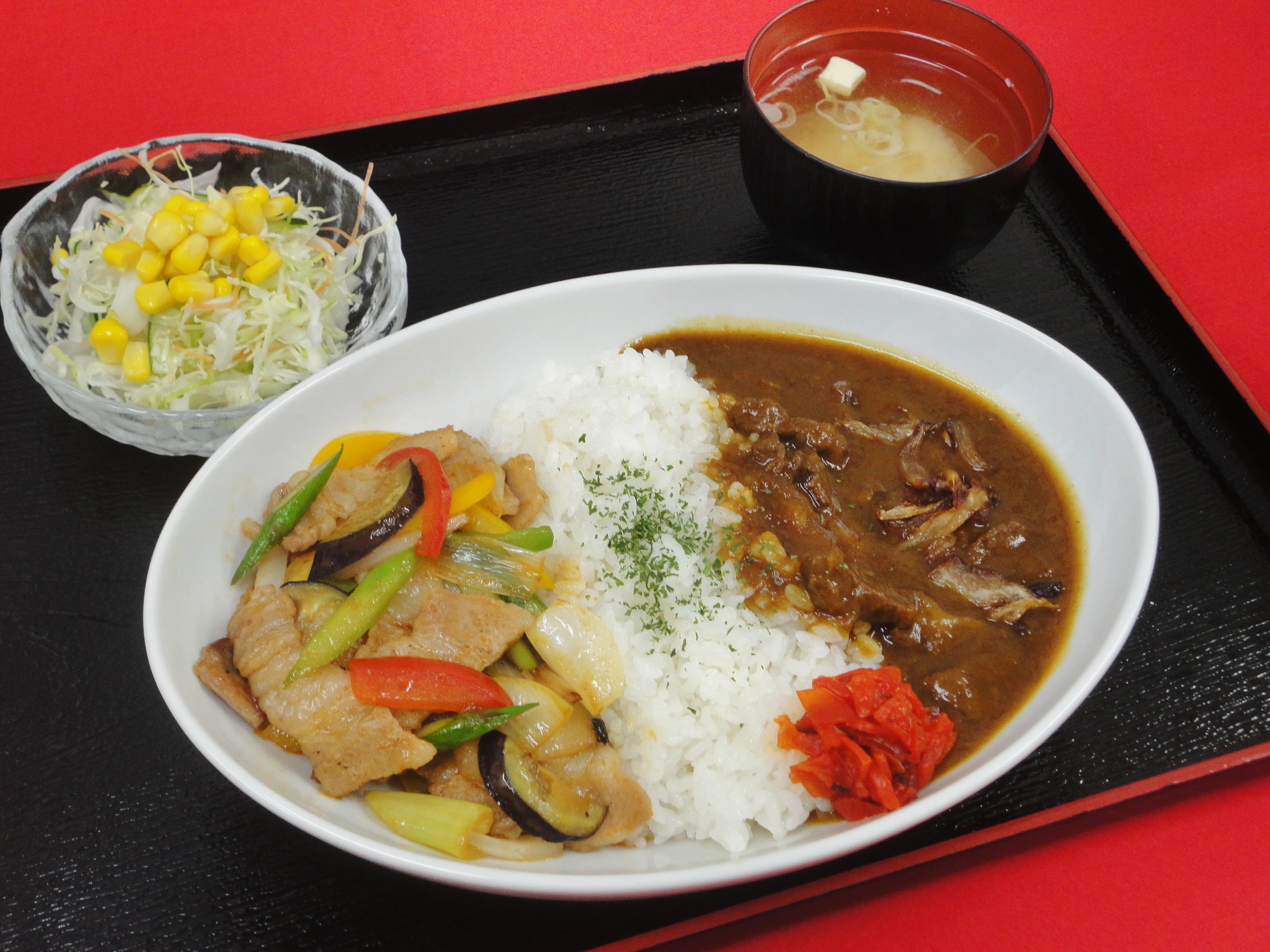 とろとろの牛すじが入ったマイルドな和風カレーに、たっぷりの豚肉と夏野菜のピリ辛炒の二つの味が楽しめる欲張りメニューです。