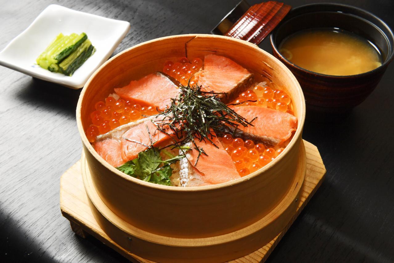新潟名物のわっぱ飯。茶飯(薄い醤油ご飯)の上に鮭とイクラをあしらった親子わっぱ飯。