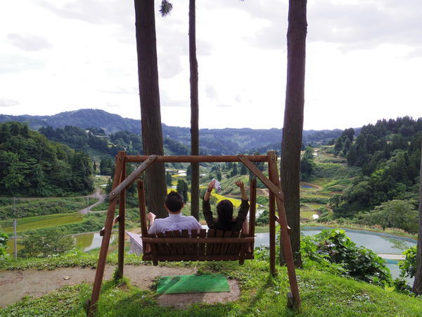 ブランコに揺られながら、棚田・棚池・遠くの山並みを望めます。