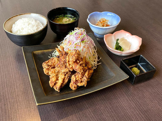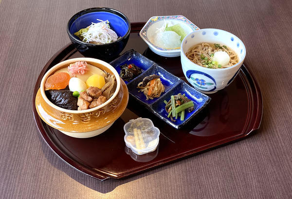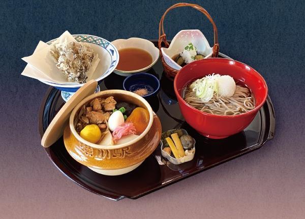 「峠の釜めし」に、自家製かけそば、ナスのおろしポン酢掛け、舞茸天ぷらがセットになった当店いちおしの逸品。ボリュームがあるので男女問わず人気のメニューです。