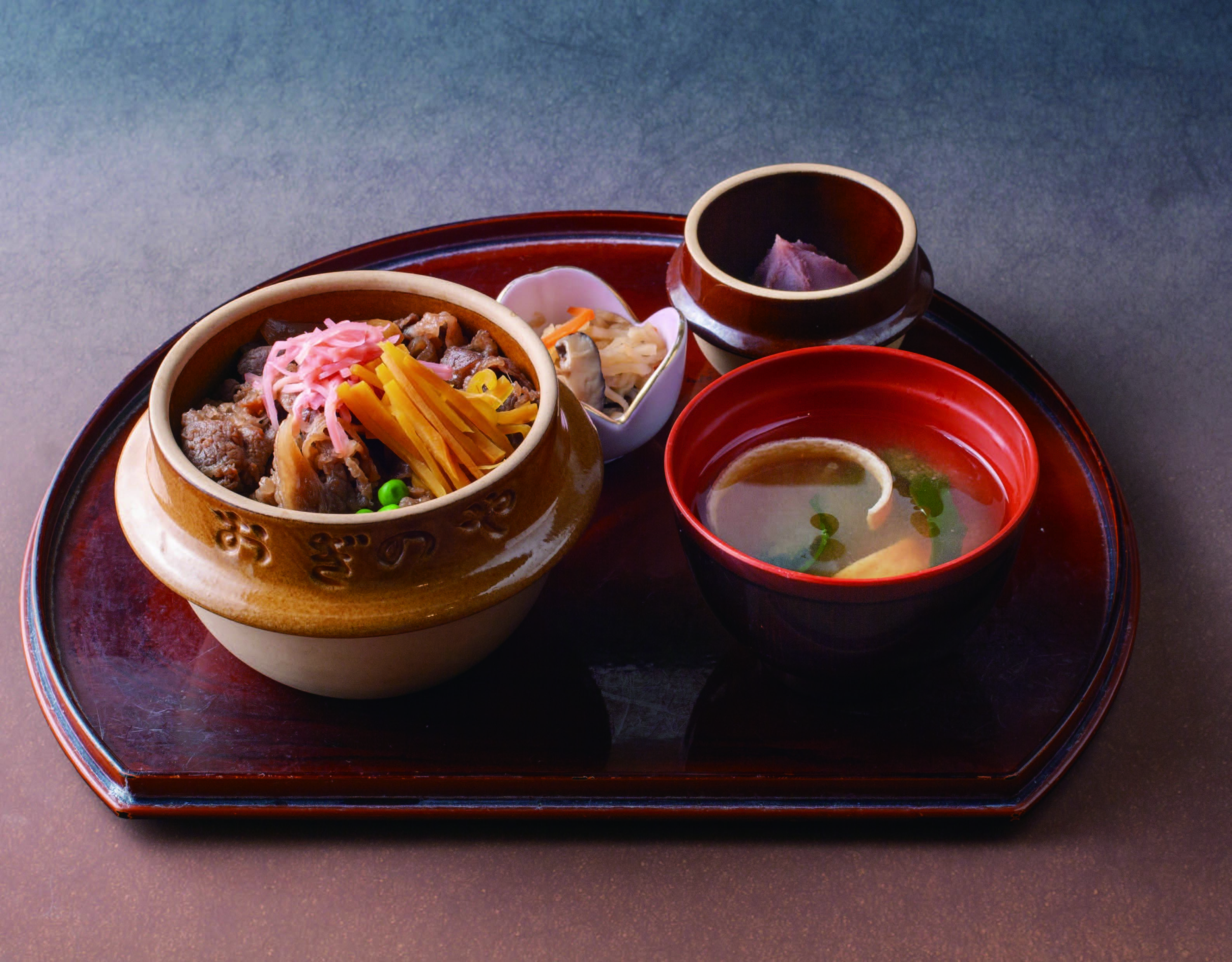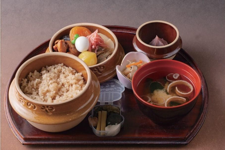 出来立ての「峠の釜めし」に小鉢と甘味が付いたセット。