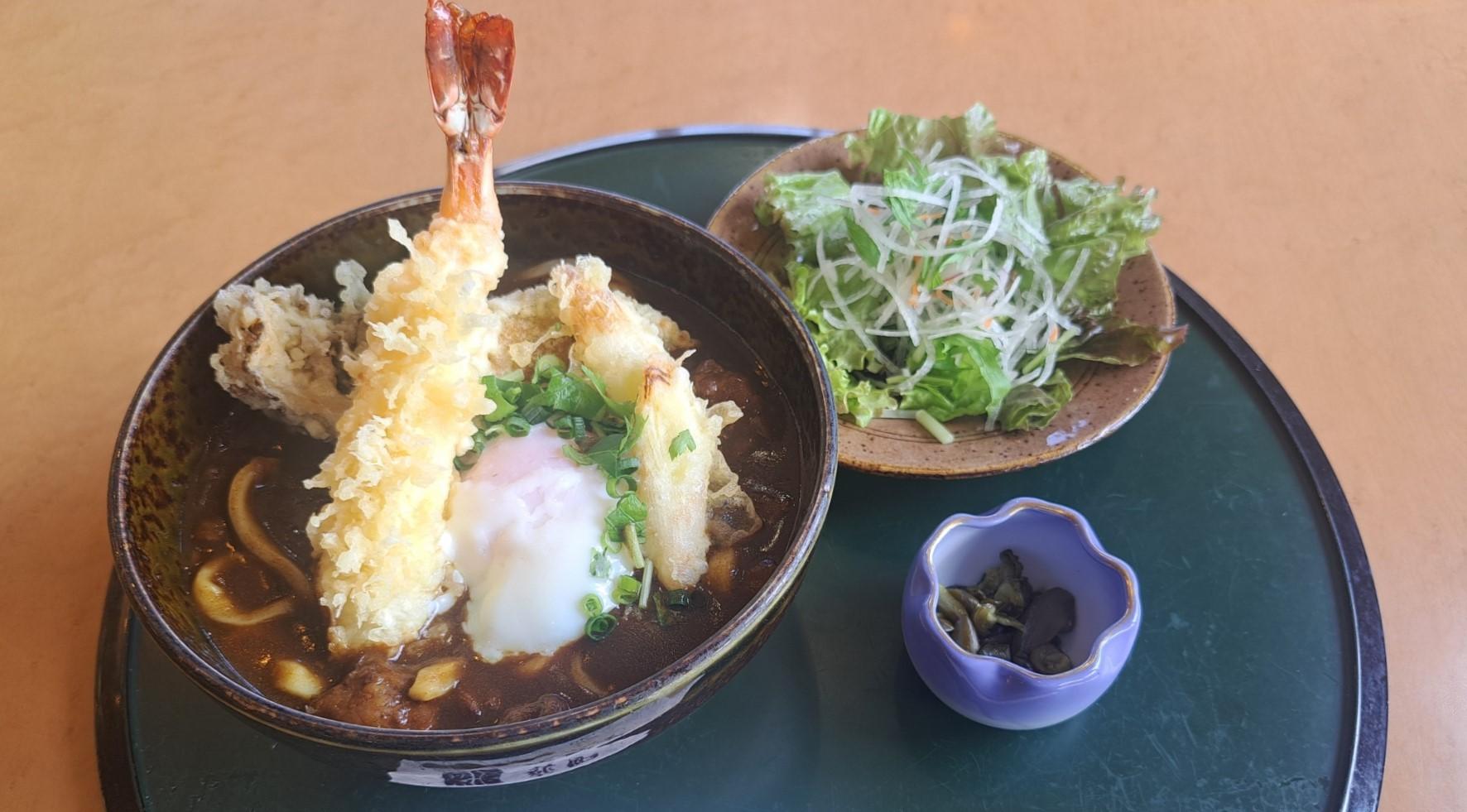 群馬県産小麦を100%使用したうどんに「荻野屋特製」のカレーとブレンドしたつゆに天ぷらと半熟卵を乗せた期間限定のカレーうどんです。サラダと小鉢が付いたお得なセット。※天ぷらの食材は季節によって変更になります。