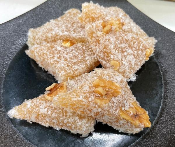 大きなくるみをのせたやわらかいしょうゆ味のゆべし。