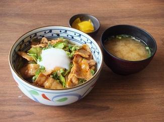 ジューシーな鶏肉とネギを地元のにんにくダレで絡めた焼き鳥丼と長野県産なめこを入れた大椀なめこ汁のセット。