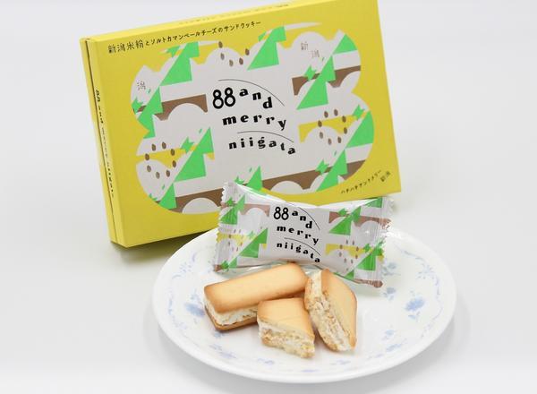 新潟県産の米粉・牛乳・佐渡の塩を使った、新潟らしさあふれるサンドクッキーです。パッケージと同じデザインの専用紙袋もお付けしています。