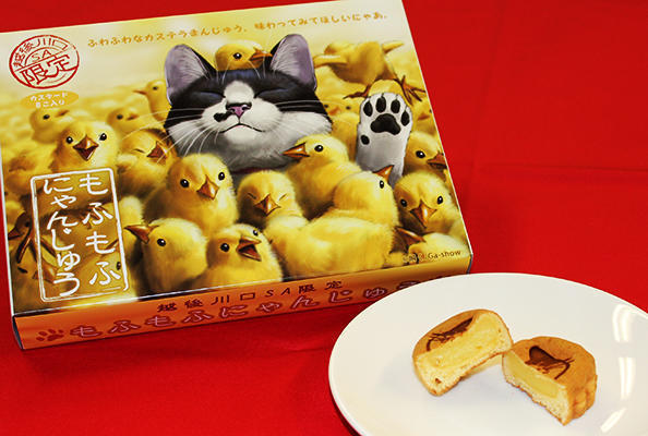 もふもふのまんじゅうにカスタードクリームが入った商品です。猫の足跡の焼き印入りで猫好きの方におすすめのお土産品です。猫のイラストの専用袋付きです。