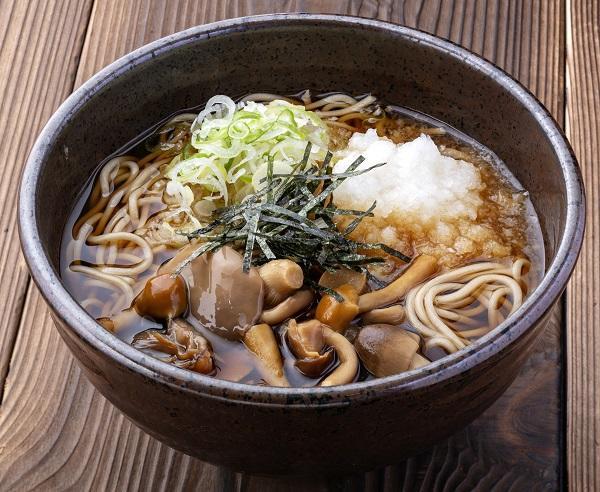 醤油とみりんで煮付けた信州らしいきのこに、大根おろしをあわせてさっぱり食べる温かいそばです。