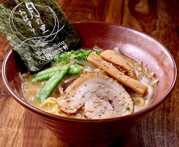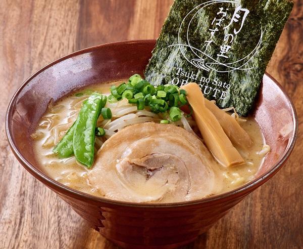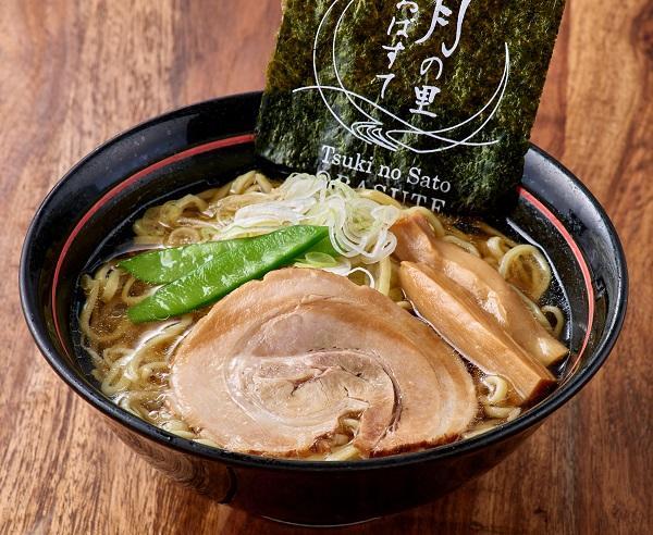 和風だしをプラスした、誰もが親しみやすい醤油ラーメン。月の里おばすてロゴ入りの海苔をトッピングしています。