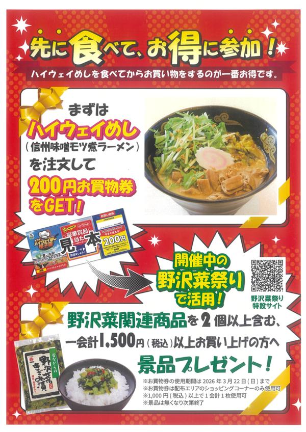 ハイウェイめしである 信州味噌®モツ煮ラーメンをご注文のお客様に売店ですぐ使えるお買物券を