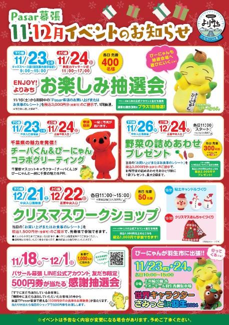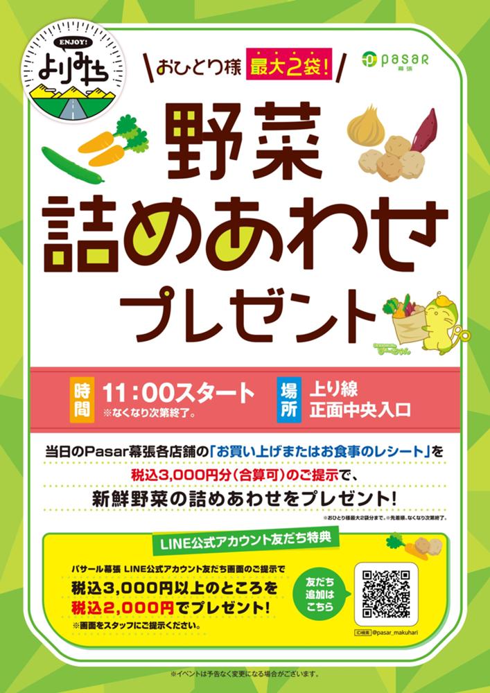 【12/28】幕張PA上り線でお米をGET!! 2025.12.19 【12/20、12/21】少し早めに出発してPasar幕張でクリスマスを楽しもう! 2025.12.15 ☆パサール幕張上り線の冬のおすすめ☆ 2025.12.03 大型免許・中型免許をお持ちのお客さまへお得情報 2025.12.03 パサール幕張(上り線) "房総・村の駅" 「12月イベント」のお知らせ 2025.12.01 11・12月イベント情報 2025.11.01 10/26(日)『お菓子詰めあわせ』プレゼントの実施 2025.10.20 <10/11(土)下り線、10/12(日)上り線>ENJOY!よりみち「抽選会」 2025.10.08 パサール幕張(上り線) "房総・村の駅" 「10月イベント」のお知らせ 2025.09.26 9・10月イベント情報 2025.09.15 パサール幕張の"秋グルメ"セレクション!★上り線★ 2025.09.01 7/30(水)~ 『LINE友だち限定 プレゼントキャンペーン』の実施 2025.07.30 7・8月イベント情報 2025.07.08 6/22(日)ENJOY!よりみち『お米プレゼント』の実施について 2025.06.20 <6/14(土)下り線、6/15(日)上り線>ENJOY!よりみち「抽選会」 2025.06.07 5・6月イベント情報 2025.05.16 パサール幕張(上り線) "房総・村の駅" 二週連続イベント開催決定!! 2025.05.14 4/27(日)『野菜の詰め合わせプレゼント』の実施について 2025.04.22 <4/16~23:上り線>パサール幕張 "房総・村の駅 7周年祭" 2025.04.15 <3/22(土):下り線><3/23(日):上り線>パサール幕張"周年祭 キャラクターお祝い抽選会" 2025.03.19 3月イベント情報 2025.03.05 パサール幕張の"春グルメ"セレクション!★上り線★ 2025.03.03 2/25(火)野菜の詰め放題プレゼント実施について 2025.02.19 2/9(日)冬のワークショップの実施について 2025.01.31 1・2月イベント情報 2024.12.31 12/24(火)野菜の詰めあわせプレゼント実施について 2024.12.17 12/22(日)クリスマスワークショップの実施について 2024.12.05 11月・12月のイベント情報 2024.11.01