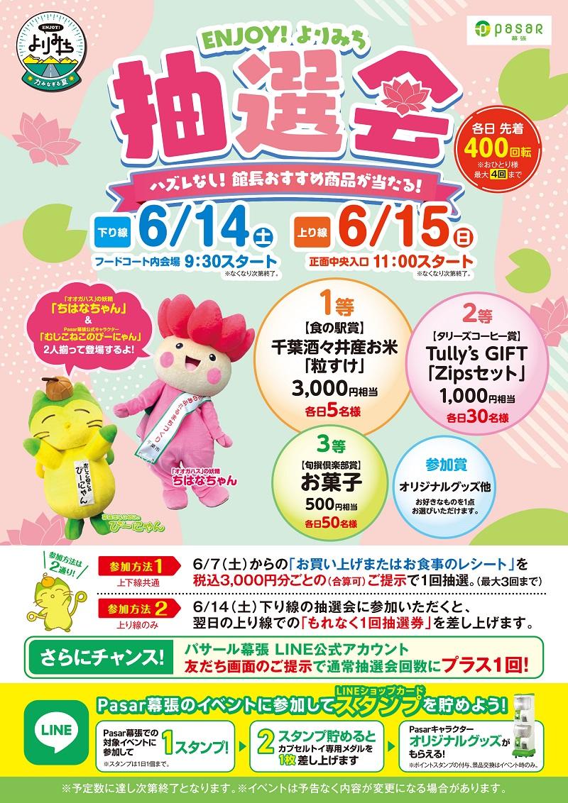 当パサール幕張をご利用いただく皆さまへの感謝の気持ちを込めまして、下記のとおり、『ENJOY!よりみち抽選会』を実施します。お馴染みパサール幕張のキャラクター"むじこねこのぴ~にゃん"や千葉市の花「オオハガハス」の妖精"ちはなちゃん"の&グルーティングや撮影会を実施しますので、是非ご参加ください。