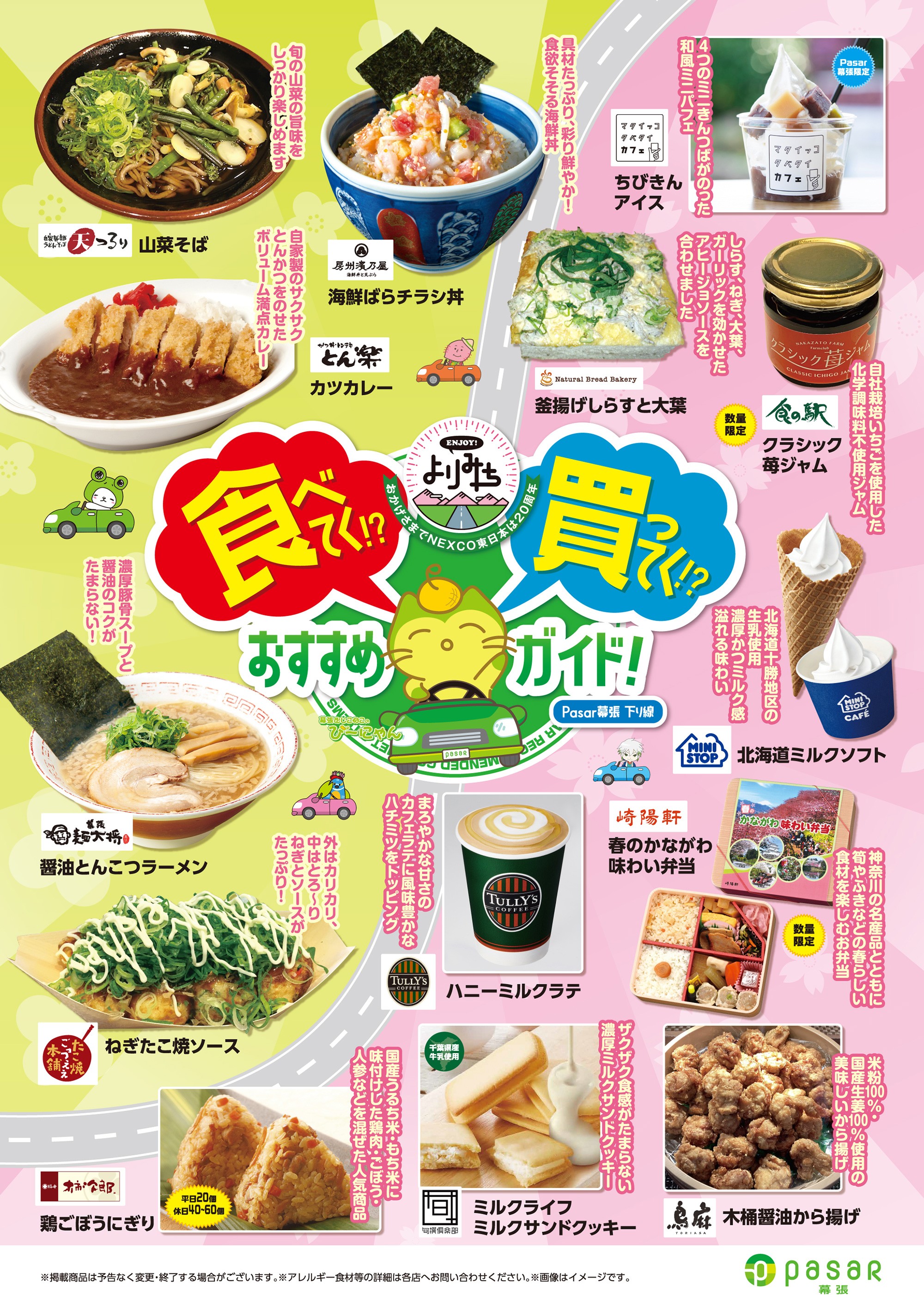 【Pasar幕張下り線】JAF会員の方にお得情報を紹介するにゃ 2026.03.13 ☆【ぴーにゃんからのお知らせ】春メニューのお知らせ(下り線) 2026.03.01 【ぴーにゃんからのお知らせ】3月イベント情報 2026.02.27 ☆パサール幕張下り線の冬のおすすめ☆ 2025.12.03 <10/11(土)下り線、10/12(日)上り線>ENJOY!よりみち「抽選会」 2025.10.08 9/21(土)タリーズ「おいしいコーヒーの淹れ方講座」 2025.09.17 9・10月イベント情報 2025.09.15 パサール幕張の"秋グルメ"セレクション!★下り線★ 2025.09.01 8/23(土)「野菜の詰めあわせプレゼント」実施について 2025.08.20 8/10(日) 千葉モノレールの「モノちゃん」がやってくる!! 2025.08.07 7/30(水)~ 『LINE友だち限定 プレゼントキャンペーン』の実施 2025.07.30 7・8月イベント情報 2025.07.08 <6/14(土)下り線、6/15(日)上り線>ENJOY!よりみち「抽選会」 2025.06.07 5/24(土)「お菓子詰め合わせ」プレゼントについて 2025.05.20 5・6月イベント情報 2025.05.16 パサール幕張(下り線) "スーベニアショップ" 二週連続イベント開催決定!! 2025.05.14 <3/22(土):下り線><3/23(日):上り線>パサール幕張"周年祭 キャラクターお祝い抽選会" 2025.03.19 3月イベント情報 2025.03.05 パサール幕張の"春グルメ"セレクション!★下り線★ 2025.03.03 【お知らせ】空調更新工事に伴う席数制限について 2025.02.27 2/8(土)冬のワークショップの実施について 2025.01.31 1/28(火)「野菜の詰め放題プレゼント」実施について 2025.01.20 1・2月イベント情報 2024.12.31 12/21(土)クリスマスワークショップの実施について 2024.12.05 11・12月のイベント情報 2024.11.01 キャラクターキャラバン in 幕張【10月6日(日)】 2024.10.06 タリーズハニー 販売数300万本突破!! おすすめですよ☆ 2024.02.12