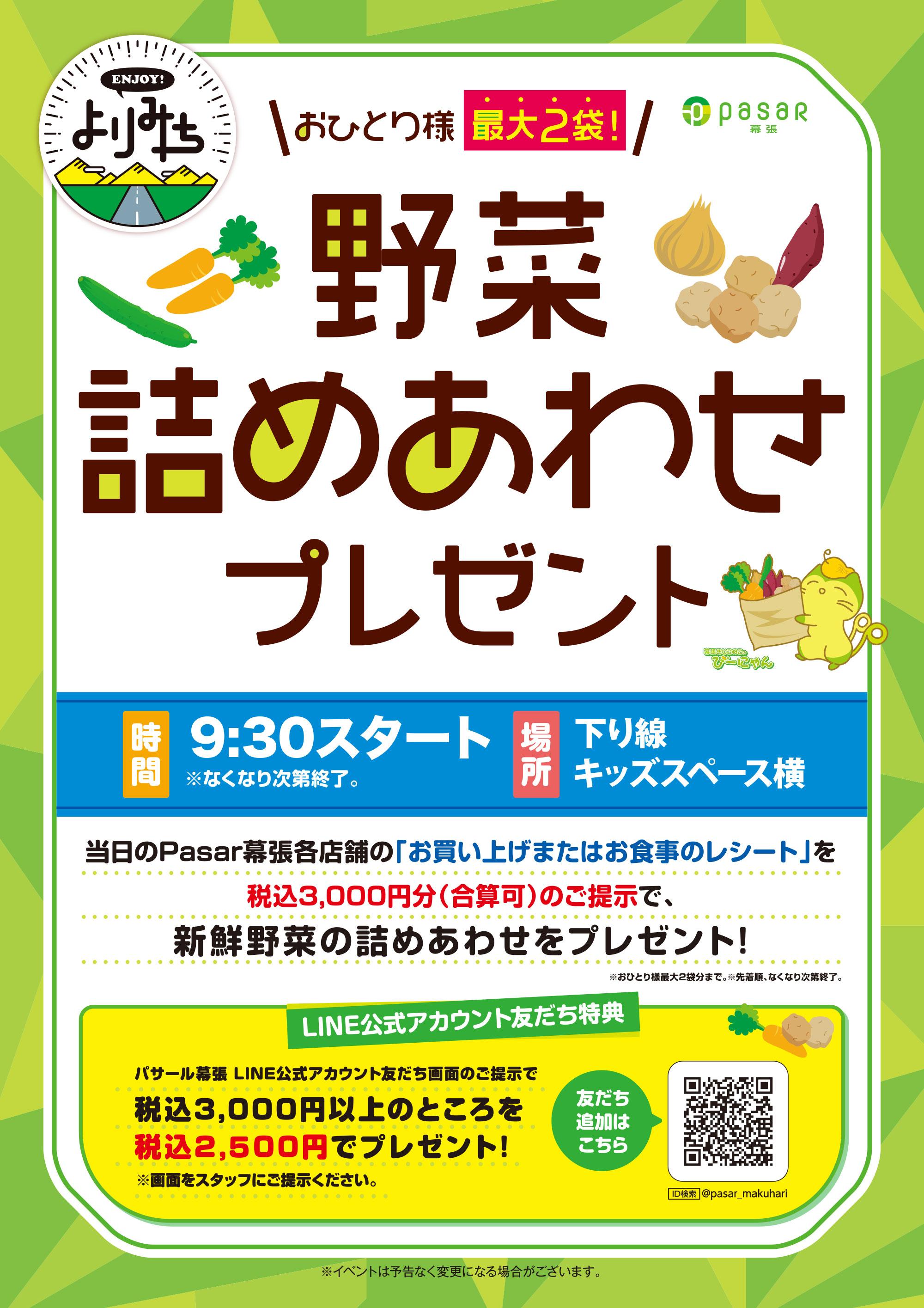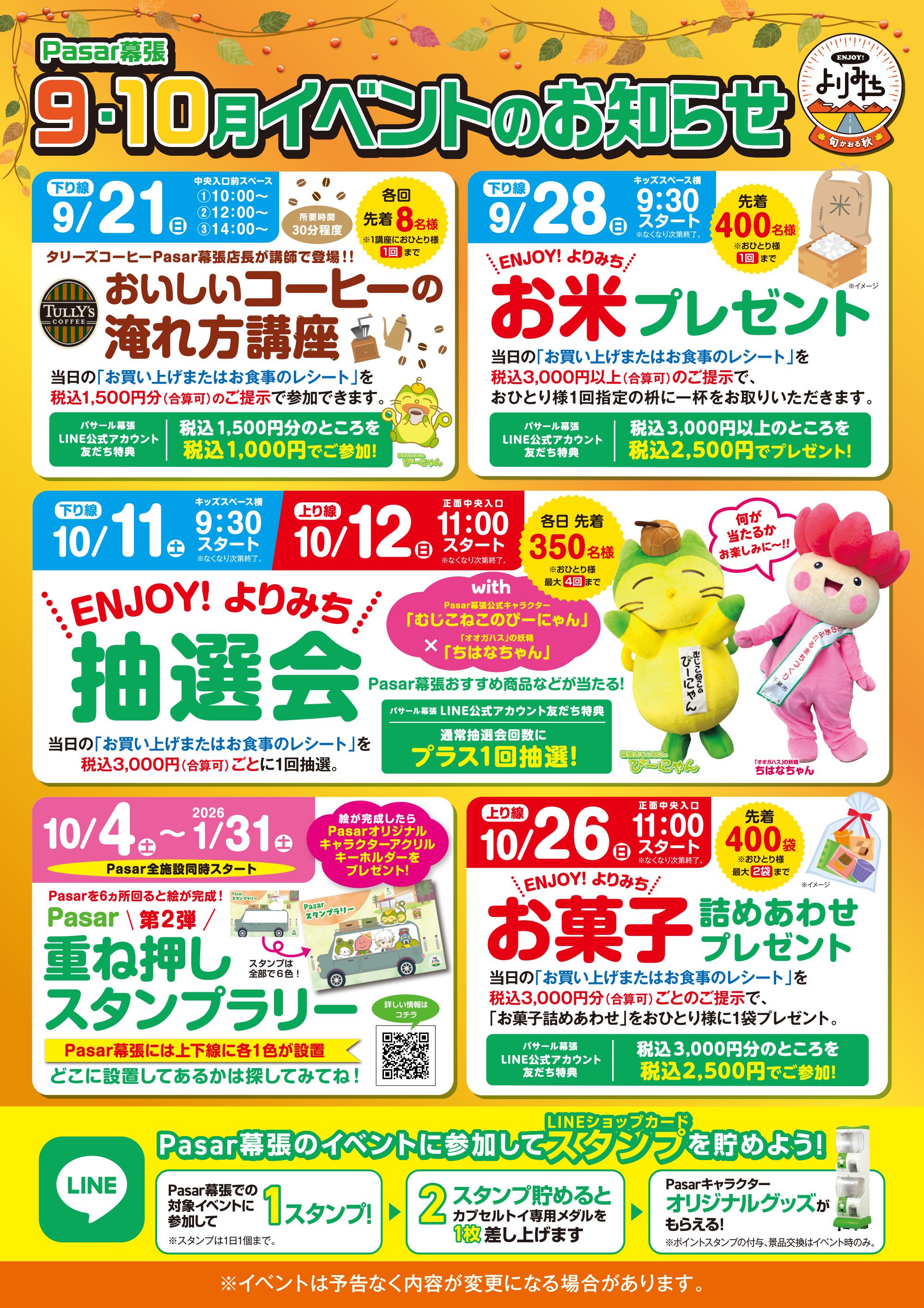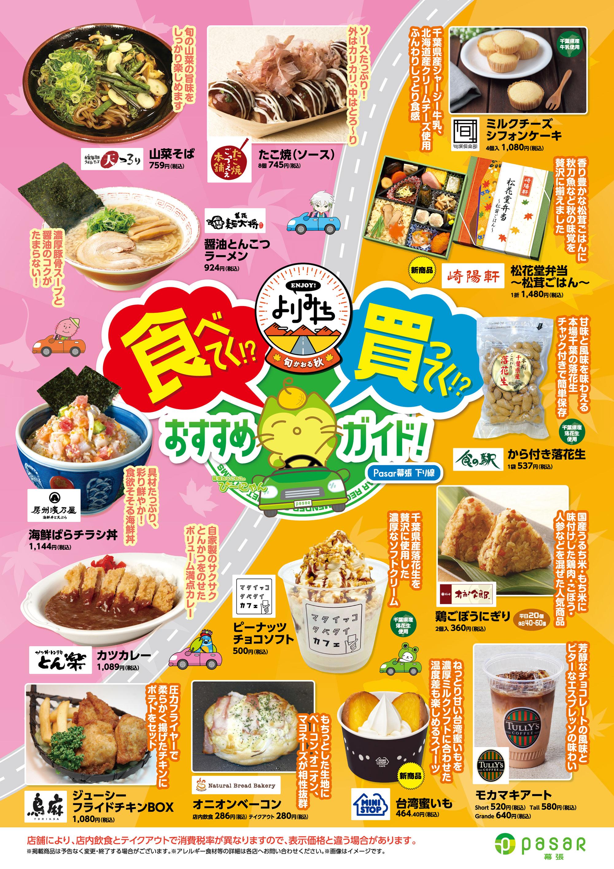 ☆パサール幕張下り線の冬のおすすめ☆ 2025.12.03 大型免許、中型免許証をお持ちのお客さまへお得情報 2025.11.25 11・12月イベント情報 2025.11.01 <10/11(土)下り線、10/12(日)上り線>ENJOY!よりみち「抽選会」 2025.10.08 9/28(日)「お米プレゼント」イベントの実施について 2025.09.24 9/21(土)タリーズ「おいしいコーヒーの淹れ方講座」 2025.09.17 9・10月イベント情報 2025.09.15 パサール幕張の"秋グルメ"セレクション!★下り線★ 2025.09.01 8/23(土)「野菜の詰めあわせプレゼント」実施について 2025.08.20 8/10(日) 千葉モノレールの「モノちゃん」がやってくる!! 2025.08.07 7/30(水)~ 『LINE友だち限定 プレゼントキャンペーン』の実施 2025.07.30 7・8月イベント情報 2025.07.08 <6/14(土)下り線、6/15(日)上り線>ENJOY!よりみち「抽選会」 2025.06.07 5/24(土)「お菓子詰め合わせ」プレゼントについて 2025.05.20 5・6月イベント情報 2025.05.16 パサール幕張(下り線) "スーベニアショップ" 二週連続イベント開催決定!! 2025.05.14 <3/22(土):下り線><3/23(日):上り線>パサール幕張"周年祭 キャラクターお祝い抽選会" 2025.03.19 3月イベント情報 2025.03.05 パサール幕張の"春グルメ"セレクション!★下り線★ 2025.03.03 【お知らせ】空調更新工事に伴う席数制限について 2025.02.27 2/8(土)冬のワークショップの実施について 2025.01.31 1/28(火)「野菜の詰め放題プレゼント」実施について 2025.01.20 1・2月イベント情報 2024.12.31 12/21(土)クリスマスワークショップの実施について 2024.12.05 11・12月のイベント情報 2024.11.01 キャラクターキャラバン in 幕張【10月6日(日)】 2024.10.06 タリーズハニー 販売数300万本突破!! おすすめですよ☆ 2024.02.12