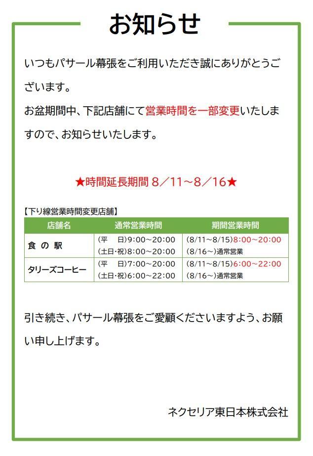 【12/20、12/21】少し早めに出発してPasar幕張でクリスマスを楽しもう! 2025.12.15 ☆パサール幕張下り線の冬のおすすめ☆ 2025.12.03 大型免許、中型免許証をお持ちのお客さまへお得情報 2025.11.25 11・12月イベント情報 2025.11.01 <10/11(土)下り線、10/12(日)上り線>ENJOY!よりみち「抽選会」 2025.10.08 9/28(日)「お米プレゼント」イベントの実施について 2025.09.24 9/21(土)タリーズ「おいしいコーヒーの淹れ方講座」 2025.09.17 9・10月イベント情報 2025.09.15 パサール幕張の"秋グルメ"セレクション!★下り線★ 2025.09.01 8/23(土)「野菜の詰めあわせプレゼント」実施について 2025.08.20 8/10(日) 千葉モノレールの「モノちゃん」がやってくる!! 2025.08.07 7/30(水)~ 『LINE友だち限定 プレゼントキャンペーン』の実施 2025.07.30 7・8月イベント情報 2025.07.08 <6/14(土)下り線、6/15(日)上り線>ENJOY!よりみち「抽選会」 2025.06.07 5/24(土)「お菓子詰め合わせ」プレゼントについて 2025.05.20 5・6月イベント情報 2025.05.16 パサール幕張(下り線) "スーベニアショップ" 二週連続イベント開催決定!! 2025.05.14 <3/22(土):下り線><3/23(日):上り線>パサール幕張"周年祭 キャラクターお祝い抽選会" 2025.03.19 3月イベント情報 2025.03.05 パサール幕張の"春グルメ"セレクション!★下り線★ 2025.03.03 【お知らせ】空調更新工事に伴う席数制限について 2025.02.27 2/8(土)冬のワークショップの実施について 2025.01.31 1/28(火)「野菜の詰め放題プレゼント」実施について 2025.01.20 1・2月イベント情報 2024.12.31 12/21(土)クリスマスワークショップの実施について 2024.12.05 11・12月のイベント情報 2024.11.01 キャラクターキャラバン in 幕張【10月6日(日)】 2024.10.06 タリーズハニー 販売数300万本突破!! おすすめですよ☆ 2024.02.12