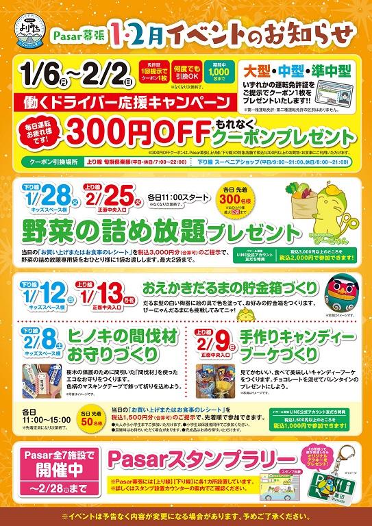 1・2月イベント情報 いつもPasar幕張をご利用いただき、ありがとうございます。 1月~2月に実施する『イベント情報』のお知らせです。 お客さまに喜んでいただけるよう様々なイベントを実施していきますので、お仕事やご旅行の際は是非お立ち寄りください。