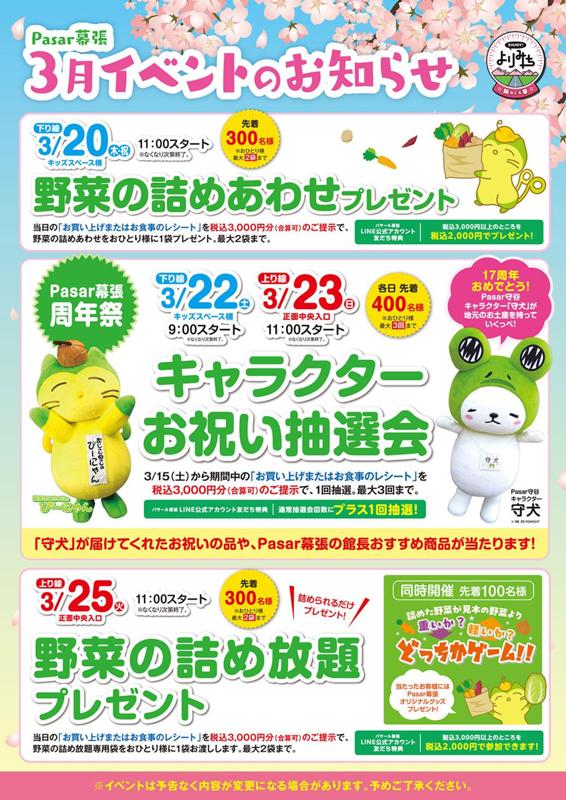 3月イベント情報 いつもPasar幕張をご利用いただき、ありがとうございます。 ✨✨3月に実施する『イベント情報』のお知らせです。✨✨ お客さまに喜んでいただけるよう様々なイベントを実施していきますので、お仕事やご旅行の際は是非お立ち寄りください。