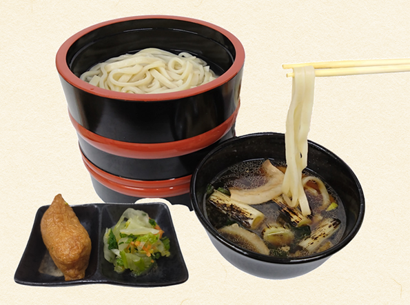 コシのあるうどんを、”深谷ねぎ“と埼玉の銘柄豚「味麗豚(みらいとん)」を使った肉汁につけてお召し上がりください。