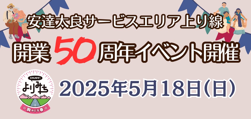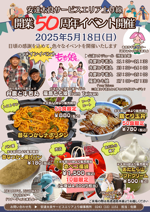 安達太良SA(上り線)は、1975年に開業し、今年で50周年を迎えました。お客さまへの日頃の感謝の気持ちを込め、5月18日(日)に記念イベントを開催します。音楽ステージや数量限定メニューなど様々な企画を用意し、皆さまのお立ち寄りを心よりお待ちしております!