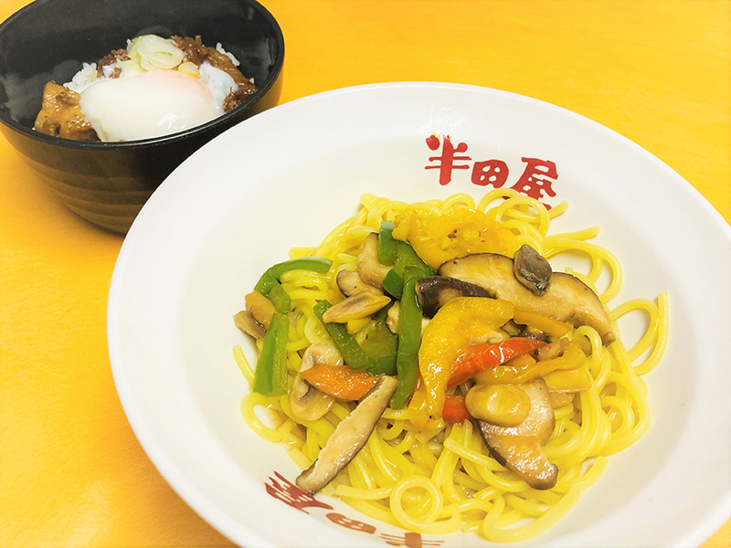 きのこミックスを和風味に整えて自家製チャーシューを使用したミニ丼とセットに。食べ応え抜群◎