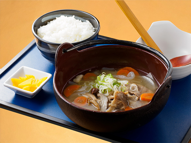 花巻特産の白金豚に国産椎茸をあわせ、根菜・きのこたっぷりな栄養満点の食べる豚汁に。食欲の秋に体が温まる一杯。