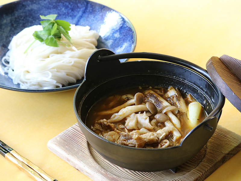 具材たっぷりのカレースープとのどごしなめらかな稲庭うどんのつけ麺です。肌寒い季節にスープが染みわたる。