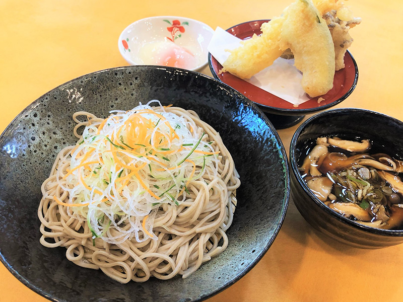 国産の蕎麦粉を使用した蕎麦に、舞茸やしめじの出汁がきいたつけ汁を合わせました。温玉で味変も楽しめます。