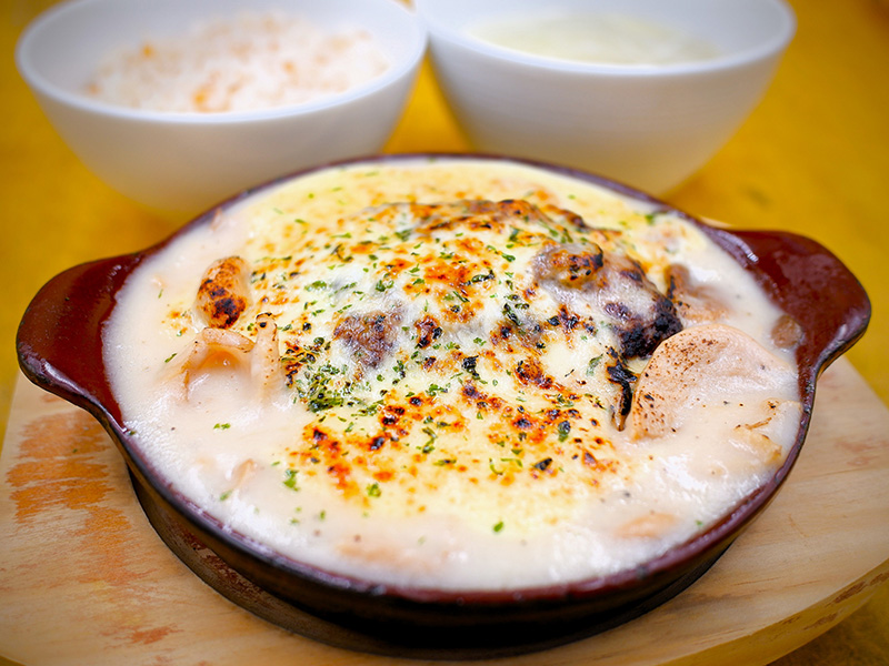 ジューシーに揚げた鶏肉にきのこを添え、濃厚ポルチーニホワイトソースを纏わせました。