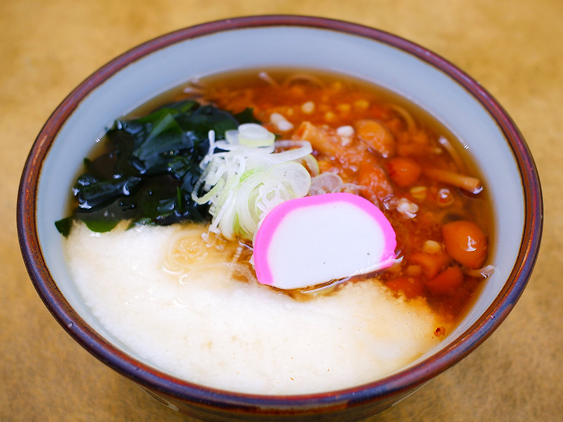 なめこのつるつる食感と、とろろのネバネバ食感がマッチした温かいおそばです。