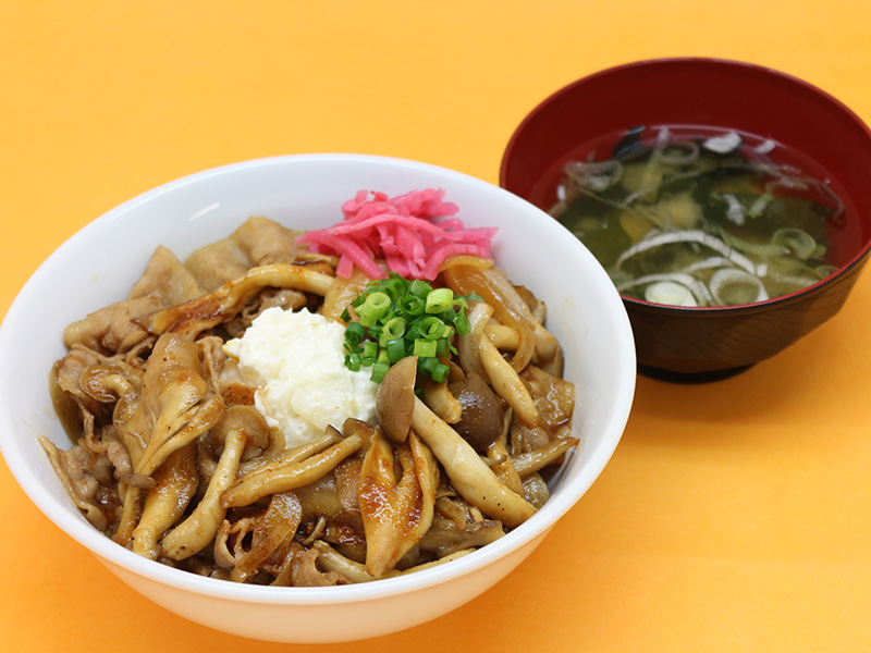 特製だれで炒めたきのことお肉にポテトサラダをトッピング。最後まで楽しめる丼です。